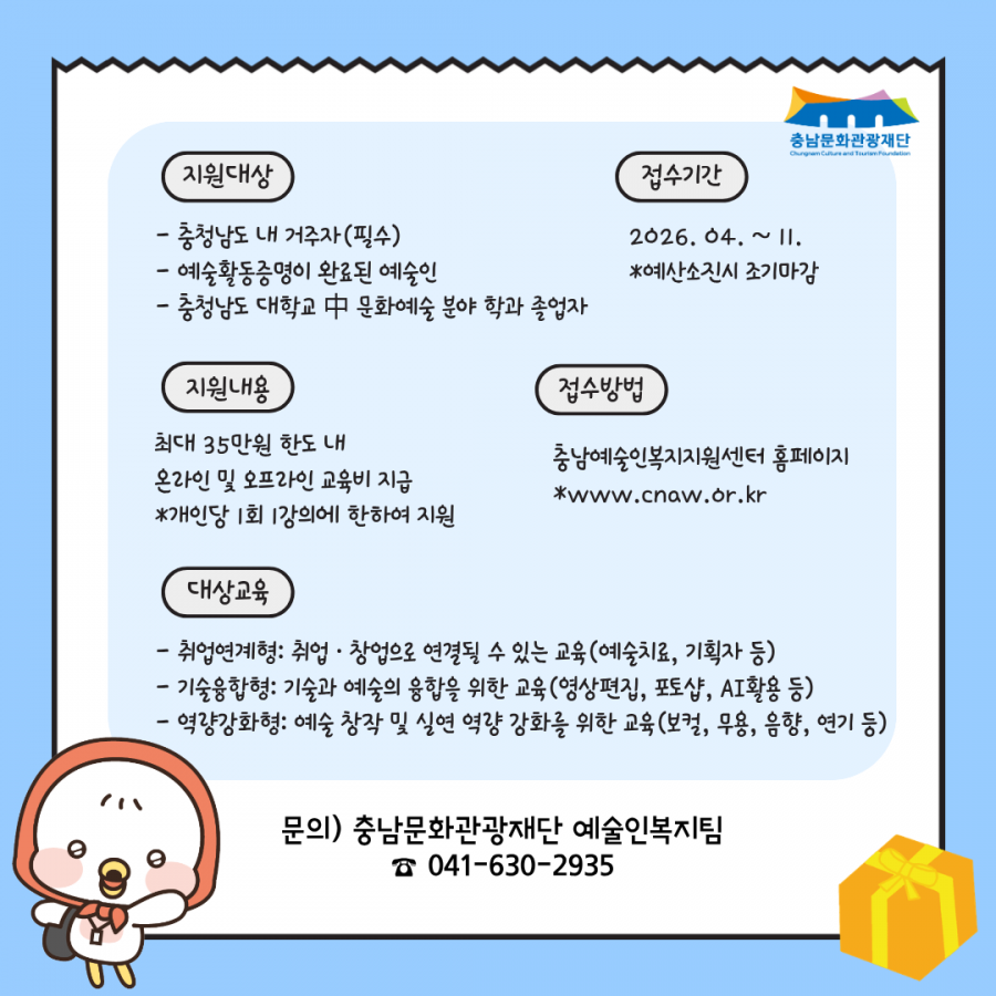 문의) 충남문화관광재단 예술인복지팀 ☎ 041-630-2935