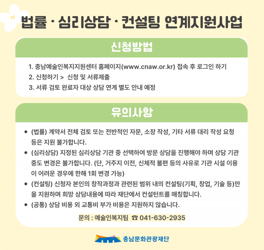 충남문화관광재단에서는 충남 예술인의 권익 보호와 심리적 안정 지원을 위해
